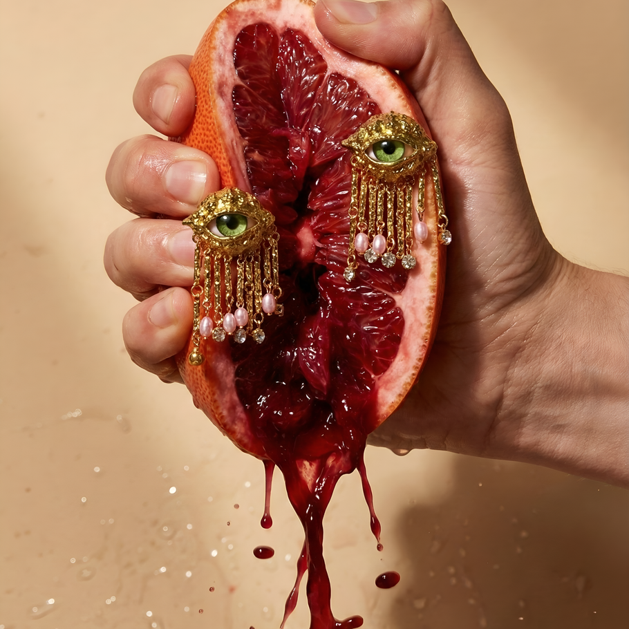 Squeeze out the drama with our Blood Citrus Eyelet Earrings — a tangy take on statement luxury. Inspired by hand-sliced blood oranges and the glisten of fresh juice, these ornate eye-shaped pieces evoke the boldness of citrus zest and the richness of jewel-toned pulp. With dangling beadwork that mimics syrupy drips, they add a juicy flourish to any ensemble — ripe, radiant, and ready to wear.